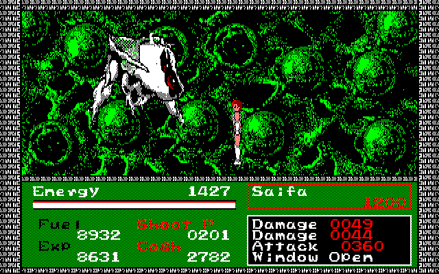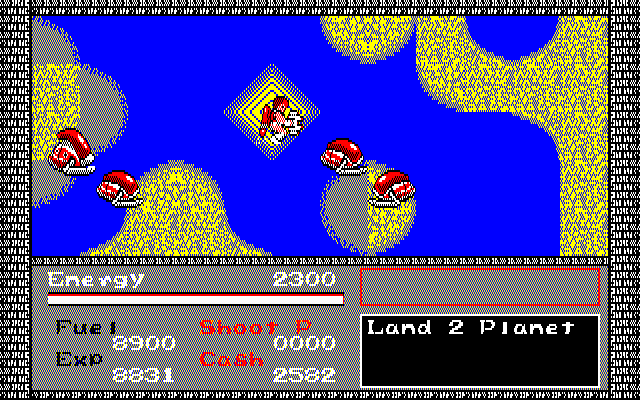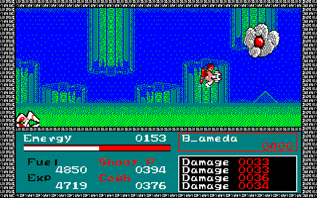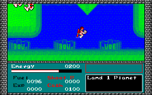 地上エリアでは、主人公が画面の真ん中あたりで浮いているような状態になっており、テンキー操作で上下左右に動かす事ができますが前述のように移動には(移動しなくても)常にFuelの消費を伴います。
