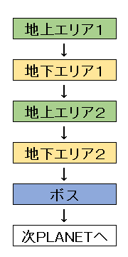 まずゲームの流れとして、本作ではひとつの惑星(ゲーム中ではPLANET)は複数の独立したエリアによって構成されており、このエリアを地上→地下→地上というように交互に移動しながら進んでいきます。