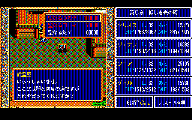 それはそうと、このナスールの町には”聖なるシリーズ”の装備が売っていた。かなり高いけれど、この先の冒険を考えれば、ここで買い揃えて置くのもいいかな?
